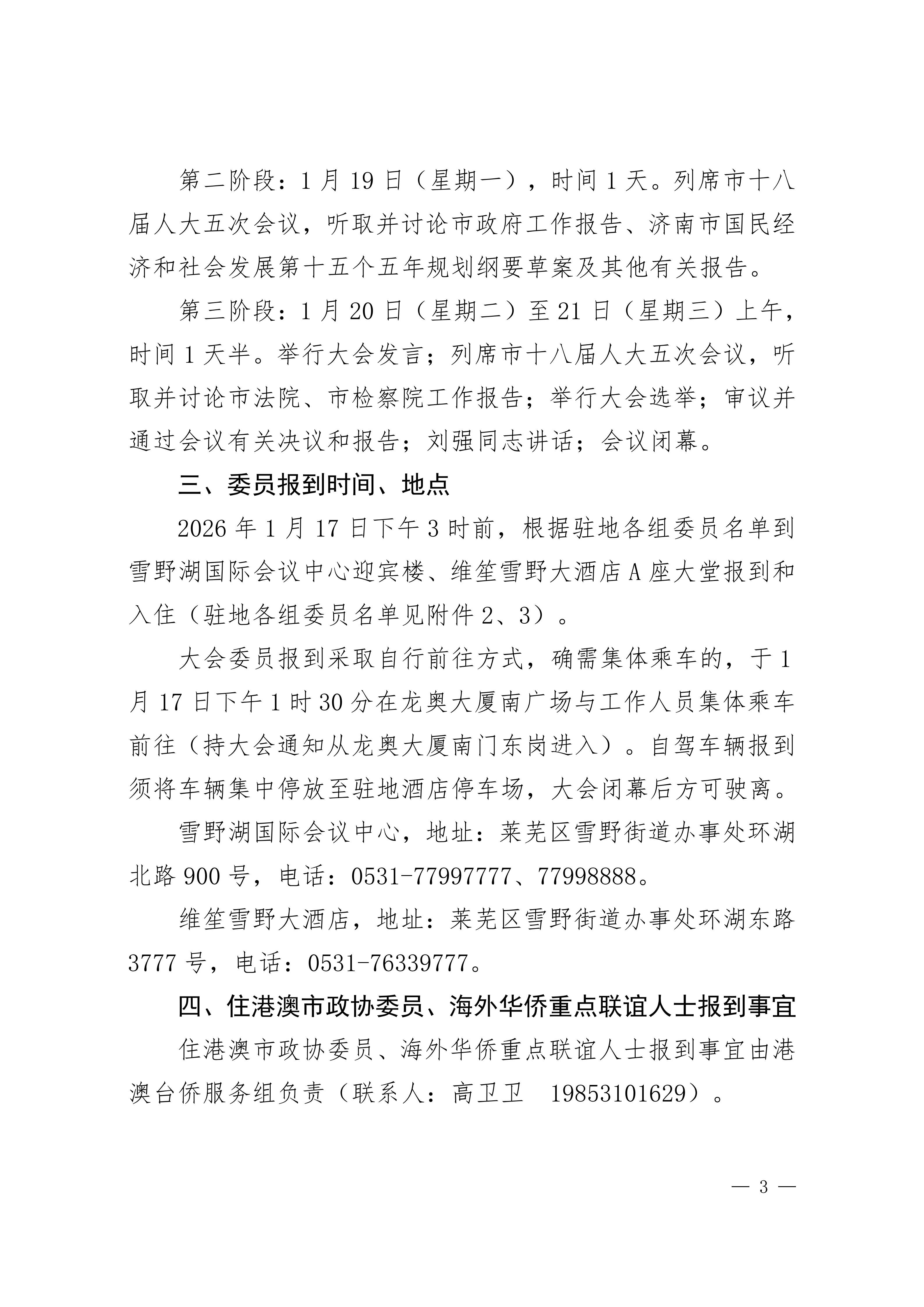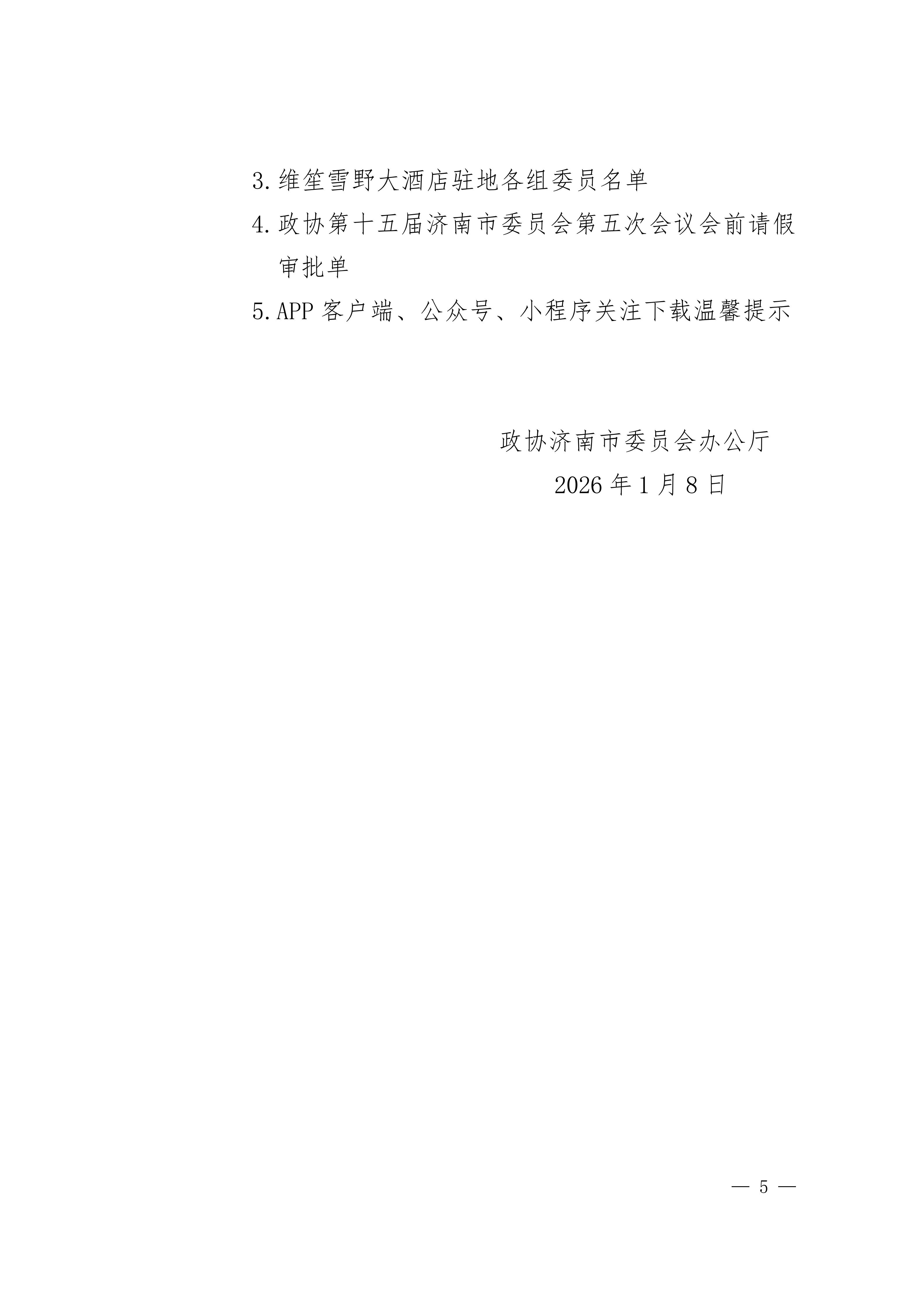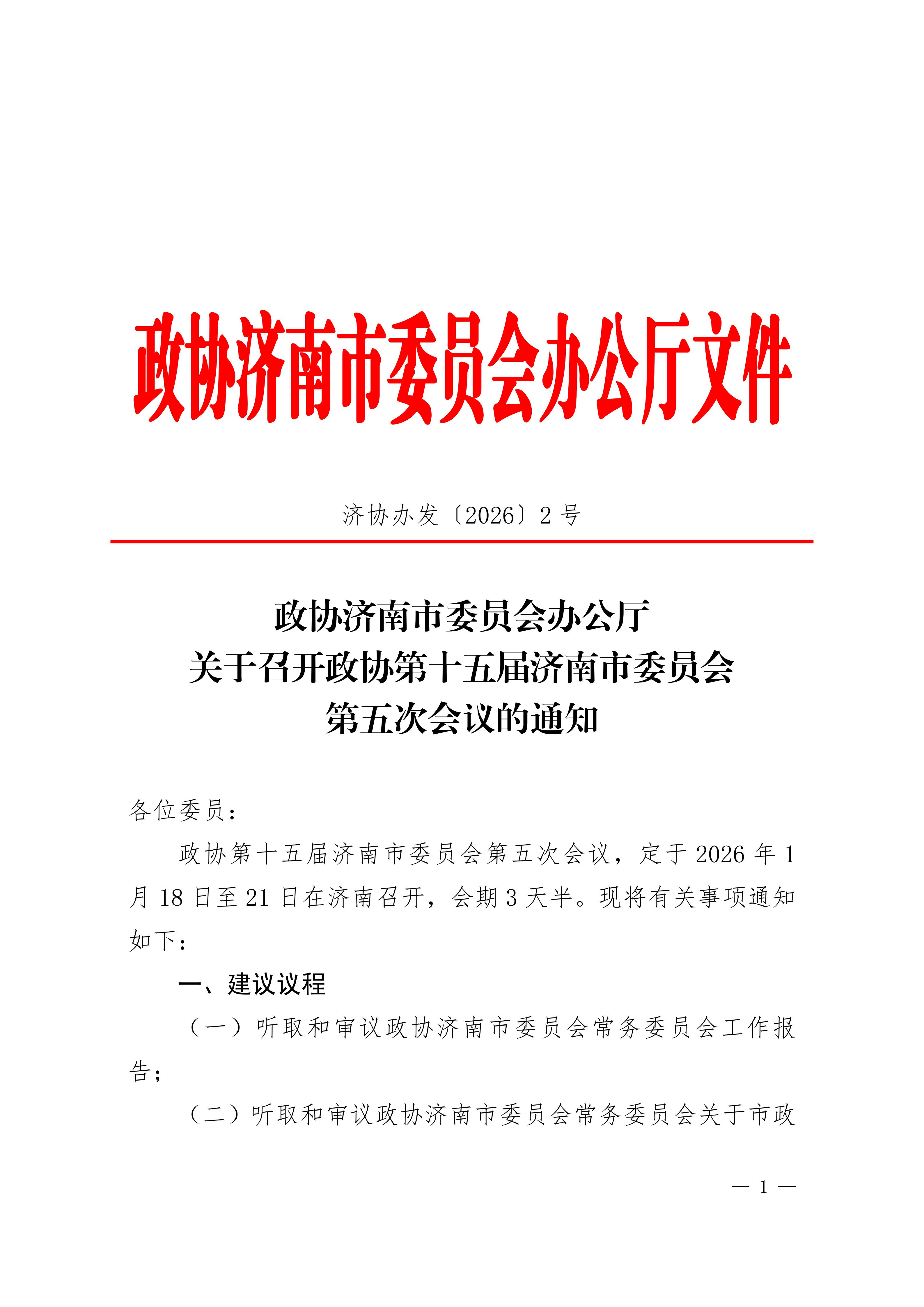 各位委员:您好!政协第十五届济南市委员会第五次会议定于2026年1月18日至21日在雪野湖国际会议中心召开,会期三天半。1月17日(星期六)15:00前委员报到。具体内容请查看《通知》文件。